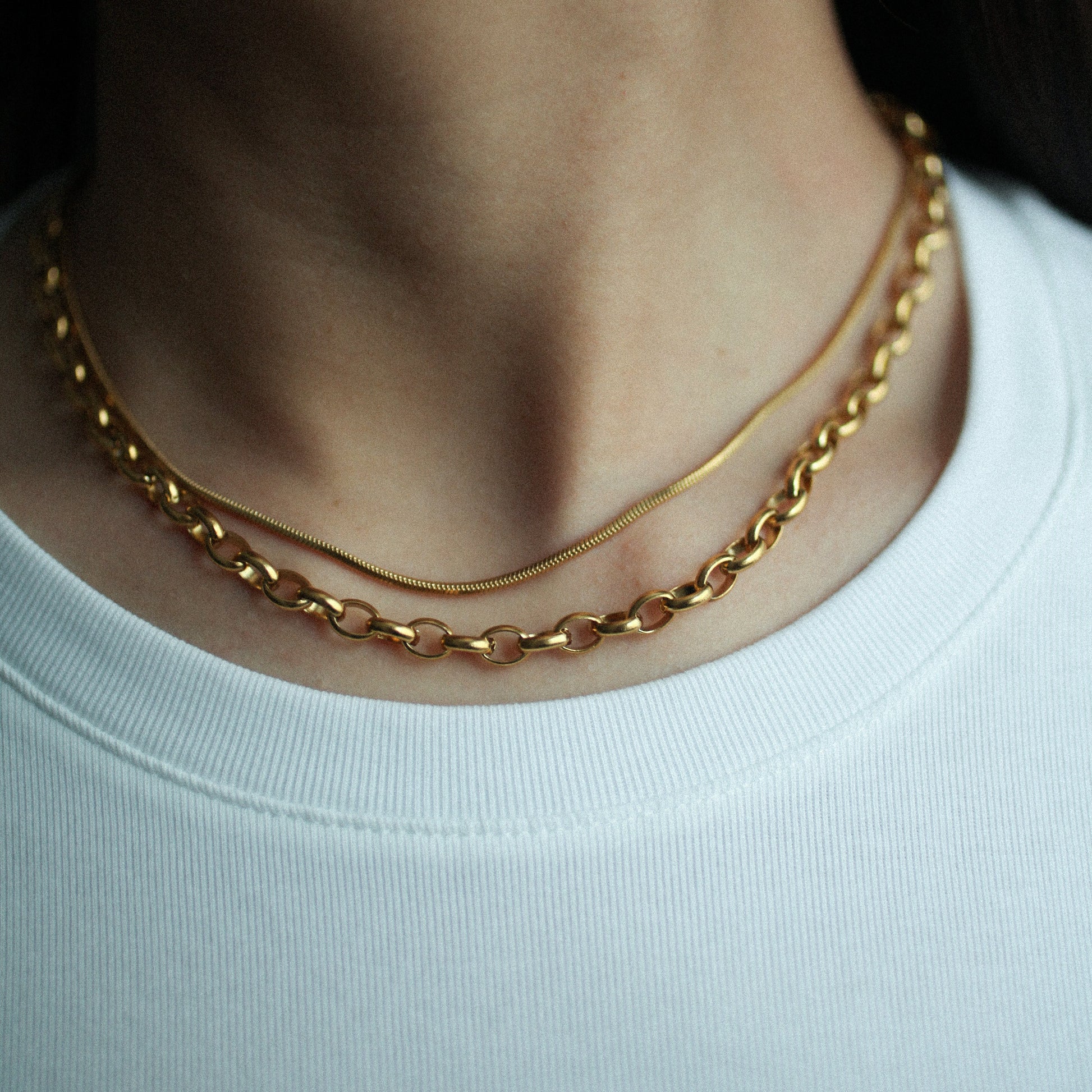チェーンの存在感と、ロングドロップのラインが印象的なデザインネックレス。